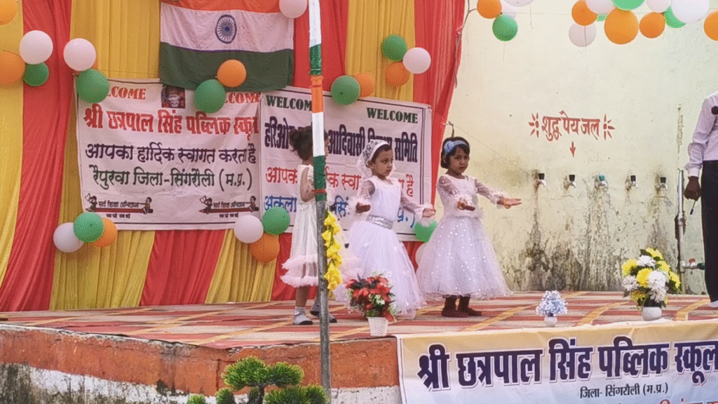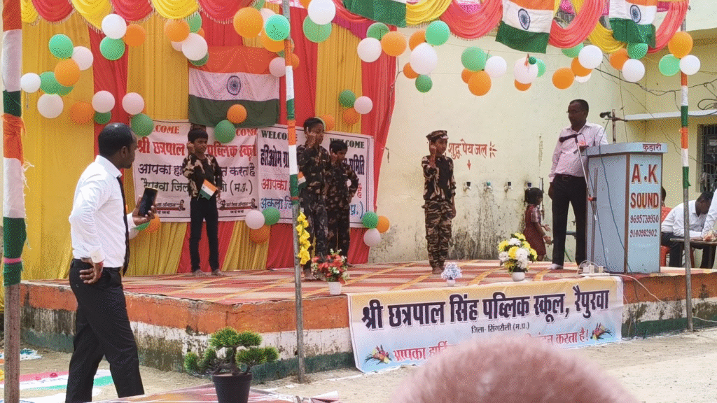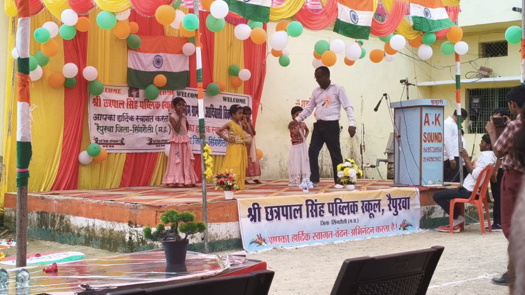हरिओम ग्रामीण आदिवासी विकास समिति द्वारा संचालित श्री छत्रपाल सिंह पब्लिक स्कूल रैपुरवा तहसील चितरंगी जिला सिंगरौली मध्य प्रदेश में 79 वॉ स्वतंत्रता दिवस बड़े धूम धाम से मनाया गया ,मंच का संचालन श्री डिगम प्रसाद विश्वकर्मा जी एवं श्री प्रदीप सिंह जी किया एवं विद्यालय में पढ़ने वाले छात्र-छात्राओं के अभिभावक वह क्षेत्र के वरिष्ठ नागरिक आम जनता विद्यालय परिवार आदि उपस्थित रहे और कई सांस्कृतिक कार्यक्रम भी करवाए गए जैसे- भ्रष्टाचार व रिश्वतखोरी पर नुक्कड़ नाटक, मोबाइल रेडिएशन पर नाटक, 12 साल से कम उम्र के बच्चे जो मोबाइल की लत लगने की वजह से भोजन नहीं करते हैं समय से और अपने माता-पिता को परेशान करते हैं उस पर नाटक, कई देश भक्ति गानों पर छोटे और बड़े सभी बच्चों का मनमोहक नृत्य, ऐसा लग रहा था समझो कल ही मिली थी हम सबको आजादी और आज हम सब मिलकर उसे मना रहे हैं बच्चों के इस नृत्य ने व अद्भुत कलाओं ने सबका ऐसा मन मोहा मानो की लग रहा था कि यह कार्यक्रम प्रतिदिन हो वहां से उठकर कहीं जाने का मन भी नहीं हो रहा था अपने भारत देश की आजादी में जितने वीर शहीद हुए थे एक तरफ हम सब उनकी याद में हम सब भावुक भी थे और दूसरी तरफ देश की आजादी का जश्न भी मना रहे थे